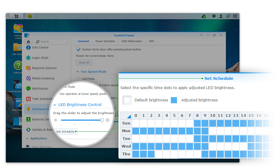 DS216j 配備可調(diào)整亮度的 LED 指示燈,讓你可以針對(duì)前方面板的 LED 燈進(jìn)行四種明暗度及排程設(shè)定,根據(jù)所處環(huán)境決定舒適的亮度。