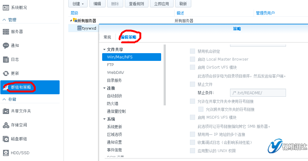 群暉Synology 山西總代:太原億維訊達(dá)科技 策略是一系列規(guī)則,其中每個規(guī)則都是指定的設(shè)置首選項,如啟用 Windows 文件服務(wù)或啟用 SSH 服務(wù)。當(dāng)一項策略被應(yīng)用到托管服務(wù)器或服務(wù)器組后,被該策略規(guī)則定義的首選項將應(yīng)用到該服務(wù)器或服務(wù)器組。這可讓您將統(tǒng)一的設(shè)置應(yīng)用多臺服務(wù)器而無需分別登錄每臺服務(wù)器。